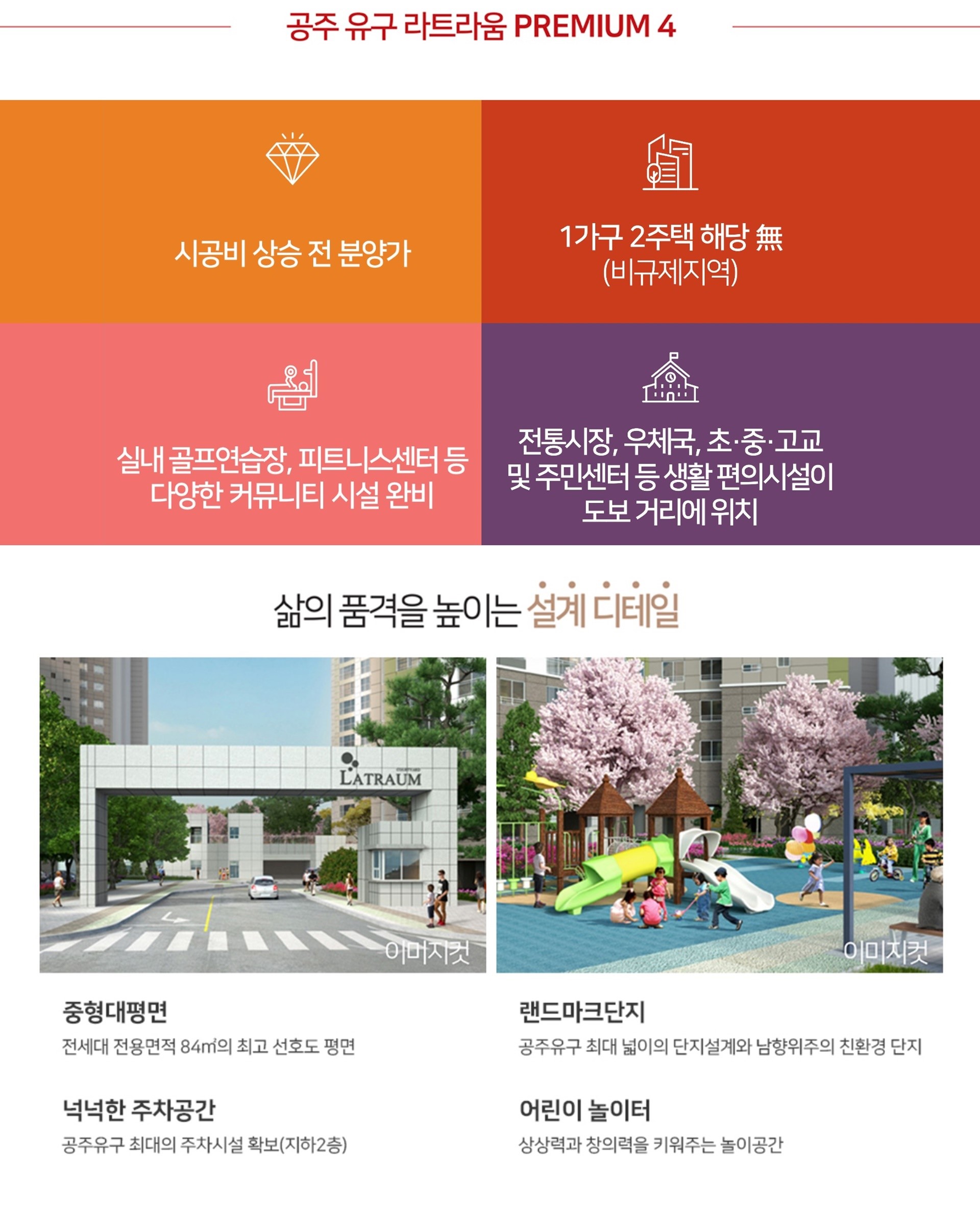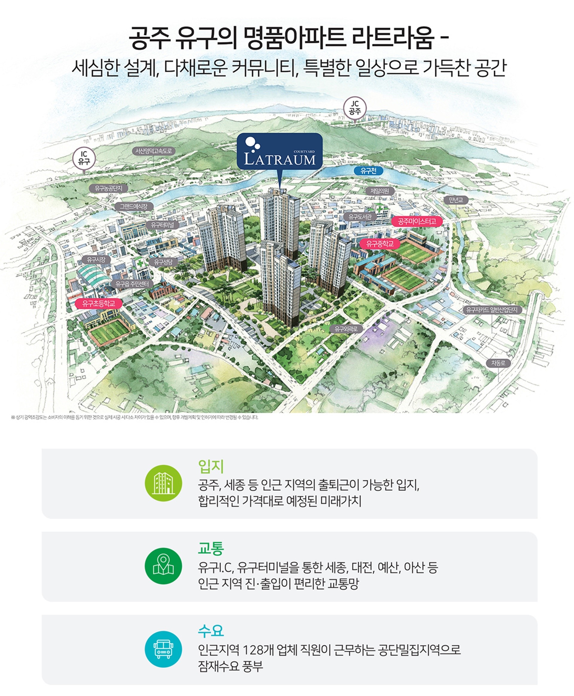 유구에서 기다려온 프리미엄 신축 지역 내 희소성 높은 신규 공급으로 누리는 자부심 오랜 기다림 끝에 찾아온 고품격 주거 공간으로 유구를 대표하는 새로운 랜드마크로서의 소장 가치를 선사합니다. 생활의 편리함을 다 갖춘 중심 입지 전통시장과 행정복지센터 등 도보권 생활 인프라 유구 시장과 관공서, 은행 등 주요 편의시설이 인접하여 입주 즉시 완성된 도심의 편리함을 그대로 누릴 수 있습니다. 쾌속 교통의 중심 광역 도로망 당진영덕고속도로 유구IC를 통한 사통팔달 연결 유구IC가 가까워 공주 시내는 물론 천안, 아산, 예산 등 인근 대도시로 빠르게 이동할 수 있는 광역 교통의 핵심입니다. 자연과 함께하는 청정 힐링 라이프 유구천과 수국 정원을 곁에 둔 쾌적한 주거 환경 아름다운 수국 정원과 유구천 산책로가 가까워 사계절 자연의 변화를 느끼며 여유로운 휴식을 만끽할 수 있습니다. 안심하고 통학하는 교육 인프라 도보 거리에 위치한 초중고교의 우수한 교육 여건 유구초, 유구중, 공주마이스터고 등이 인근에 포진하여 아이들의 안전한 등하교와 안정적인 교육 환경을 보장합니다. 라트라움만의 혁신 특화 설계 공간의 효율성을 높인 최신 평면과 고품격 마감재 입주민의 라이프스타일을 고려한 세련된 설계와 차별화된 인테리어를 통해 생활의 품격을 한 단계 더 높였습니다.